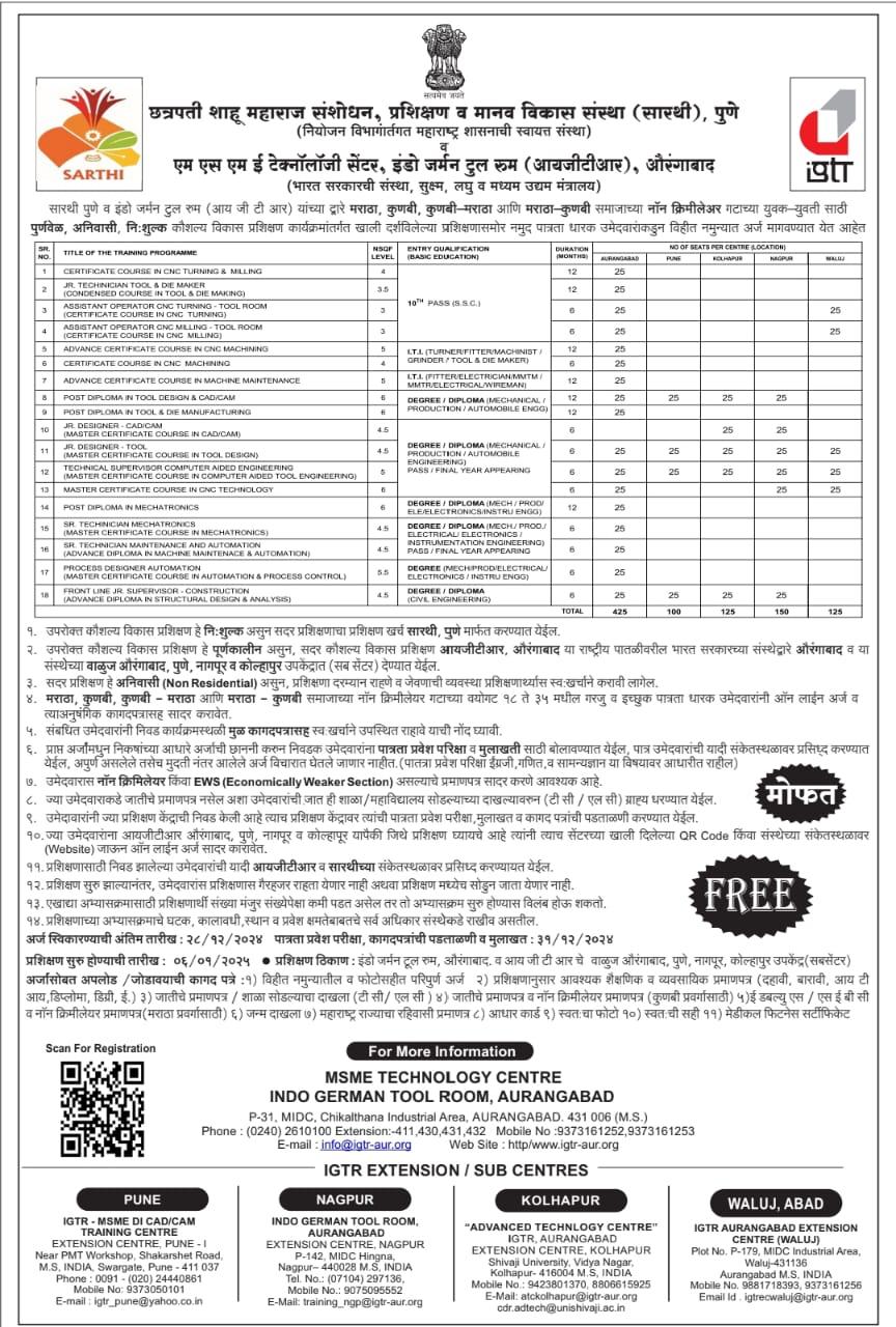 श्रीमंत मालोजीराजे भोसले सारथी (सारथी) पुणे व इंडो जर्मन टुल (IGTR), औरंगाबाद कौशल्य विकास प्रशिक्षण कार्यक्रम